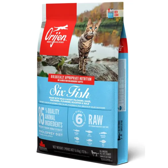 Сухой беззерновой корм Orijen Cat 6 fish – изготовлен из сырой выловленной в природе сардины, хека, скумбрии, камбалы, морского окуня и камбалы. Первые 6 мясных ингредиентов свежие или сырые, включая птицу и рыбу.