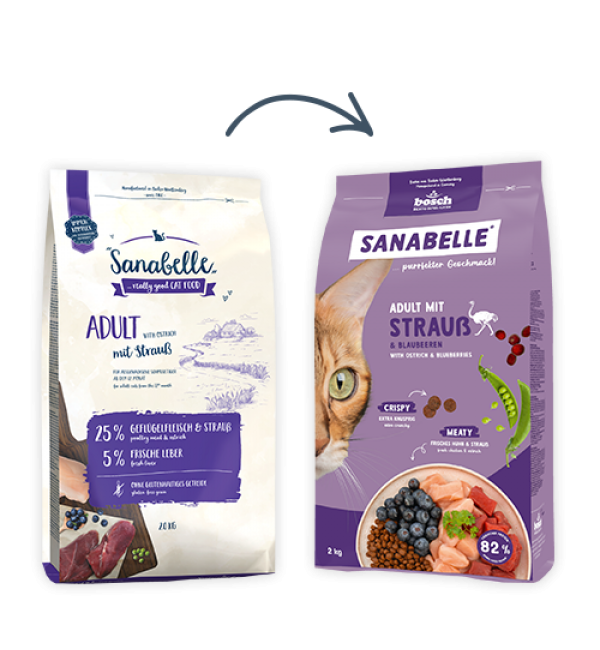 Корм Bosch Sanabelle ADULT ostrich произведён на основе свежего мяса курицы для взрослых кошек всех пород. Состав корма, насыщенный питательными веществами и минералами, позволяет кошкам получать все необходимые полезные микроэлементы и компоненты для здоровья, рецепт способствует нормализации пищеварения и не вызывает аллергий. Корм легко усваивается и даёт кошкам заряд бодрости и энергии.  Высокое качество ингредиентов даёт корму насыщенный и выдающийся вкус.