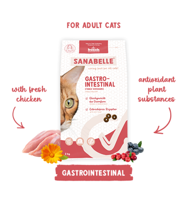 Корм Sanabelle Gastrointestinal, в состав которого входят легкоусвояемые источники белка, такие как белок свежей и сушеной птицы, обеспечивает сбалансированное поступление незаменимых аминокислот. Это снижает нагрузку на желудочно-кишечный тракт кошки и улучшает усвоение питательных веществ, обеспечивая ей больше энергии и жизненных сил.