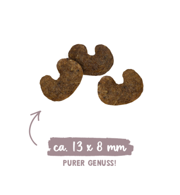 Состав: мясо птицы (свежее, 20 %), рис, рисовая мука, животный жир, свежая печень (5 %), шкварки (сушеные), белок из птицы (сушеный), сушеный свекольный жом (обессахаренный), мука, белковый гидролизат, гороховые волокна, картофельный белок, целлюлоза, масло лосося, льняное семя, рыбная мука, цельное яйцо (сушеное), карбонат кальция, дрожжи (сушеные, в т. ч. 0,1 % маннанолигосахаридов, 0,06 % бета-глюканов), хлорид калия, ягоды брусники (сушеные), ягоды голубики (сушеные), зеленые мидии (сушеные), цветы календулы (сушеные), цикорий салатный (сушеный), юкка (сушеная).