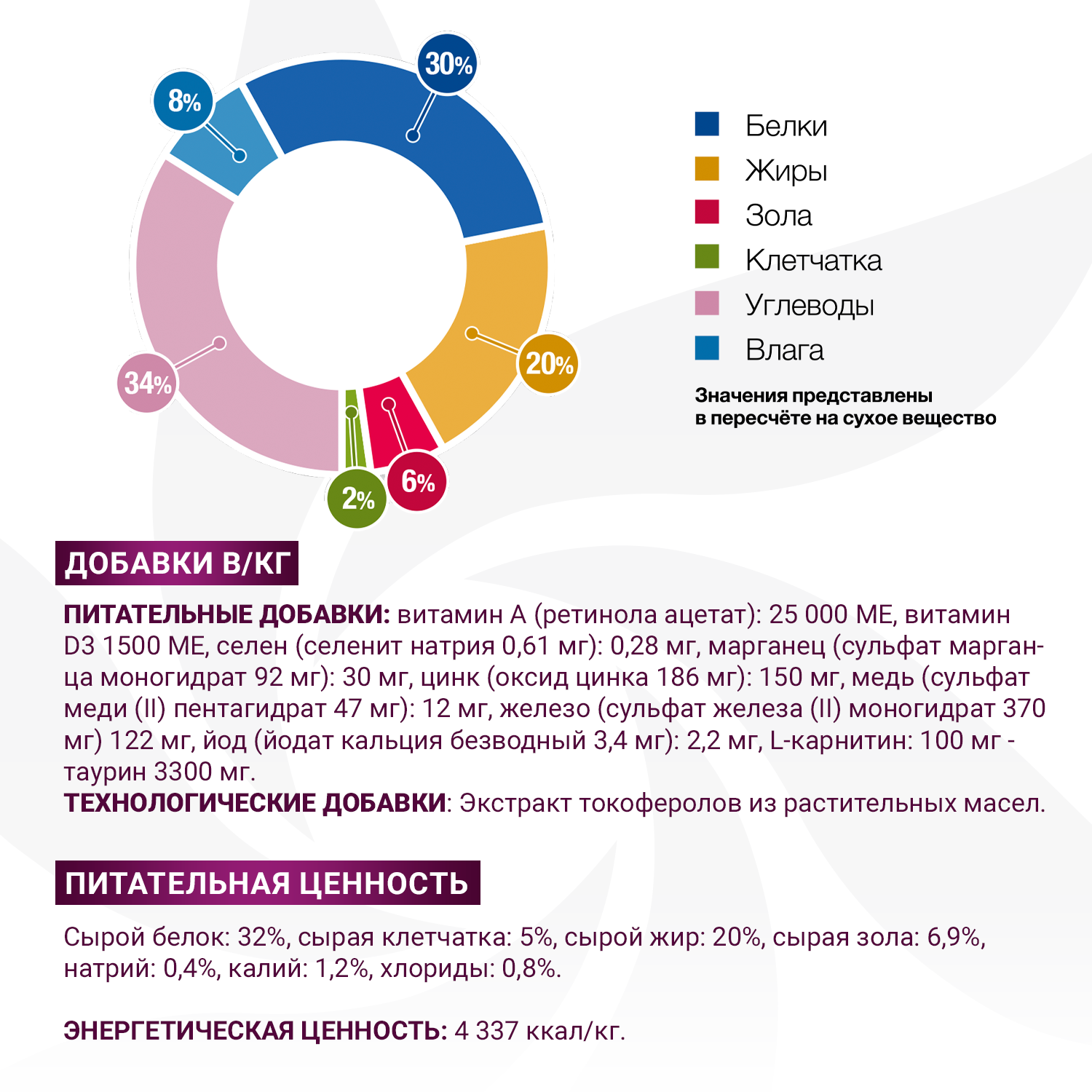 Питательные добавки: витамин А (ретинола ацетат): 25 000 МЕ, витамин D3 1500 МЕ, селен (селенит натрия 0,27 мг): 0,12 мг, марганец (сульфат марганца моногидрат 77 мг): 25 мг, медь (сульфат меди (II) пентагидрат 39 мг): 10 мг, железо (сульфат железа (II) моногидрат 249 мг) 82 мг, йод (йодат кальция безводный 7.3 мг): 4.8 мг, L-карнитин: 100 мг, таурин 2 500 мг.