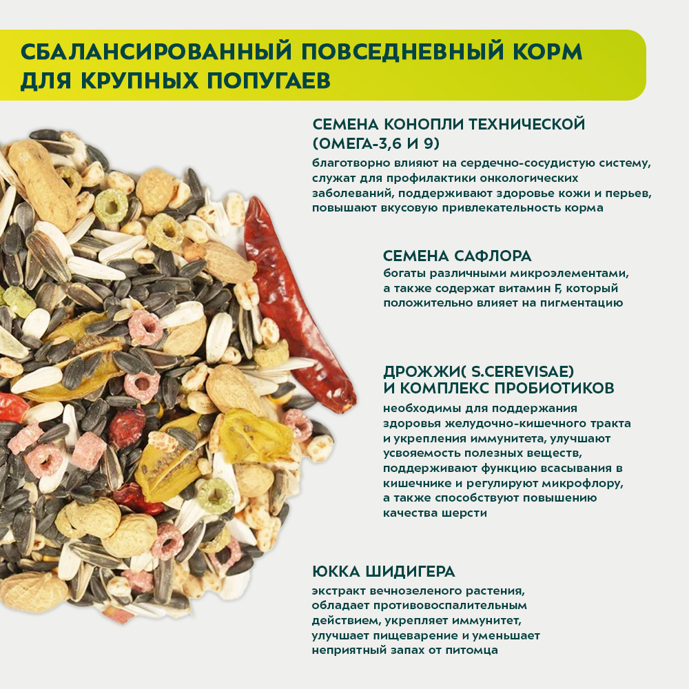 Состав: Семена подсолнечника, витаминные гранулы, сафлор, кукуруза, семена подсолнечника полосатые, семена подсолнечника белые, овес голозерный, пшеница, семена гречихи, ячмень, сорго, рис падди, арахис, семена тыквы, семена конопли технической, кусочки кэроба, арахис в скорлупе, сушеные яблоки, чипсы банана, сушеный киви, кешью, воздушная пшеница, плоды шиповника, ракушка морская, перец чили, юкка шидигера, комплекс пробиотиков, натуральный адсорбент - дрожжи (S.cerevisae).