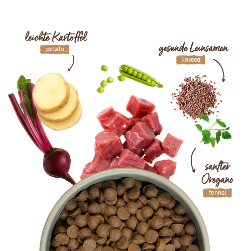 Состав: Свежая говядина (62%), картофельная мука, говяжий белок (сушеный, 8%), горох (сушеный), льняное семя, гидролизат белка (вегетарианский), свекла (сушеная, 1%), орегано (сушеный, 0,2%), петрушка (сушеная, 0,2%), кориандр (0,2%), хлорид калия.