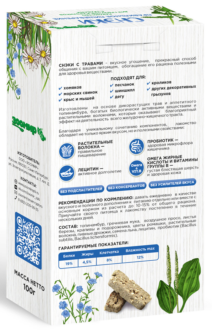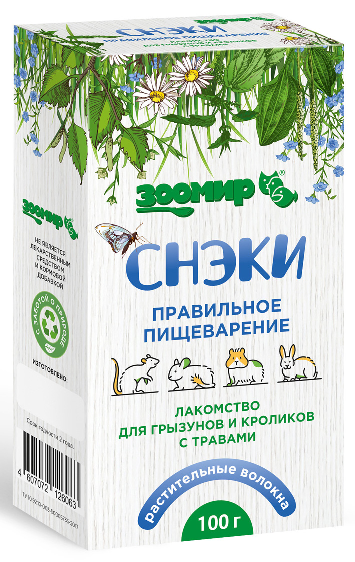 Главная Каталог Зоотовары Корм для грызунов Лакомства 100г Лакомство ЗООМИР "Снэки правильное пищеварение" для грызунов и кроликов с Травами