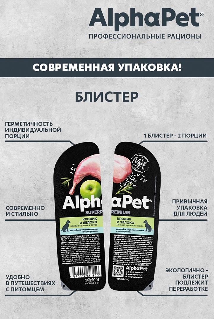 Главная Каталог Зоотовары Корм для собак Консервы 100г Влажный корм AlphaPet Superpremium для собак с чувствительным пищеварением, Кролик и яблоко кусочки в соусе