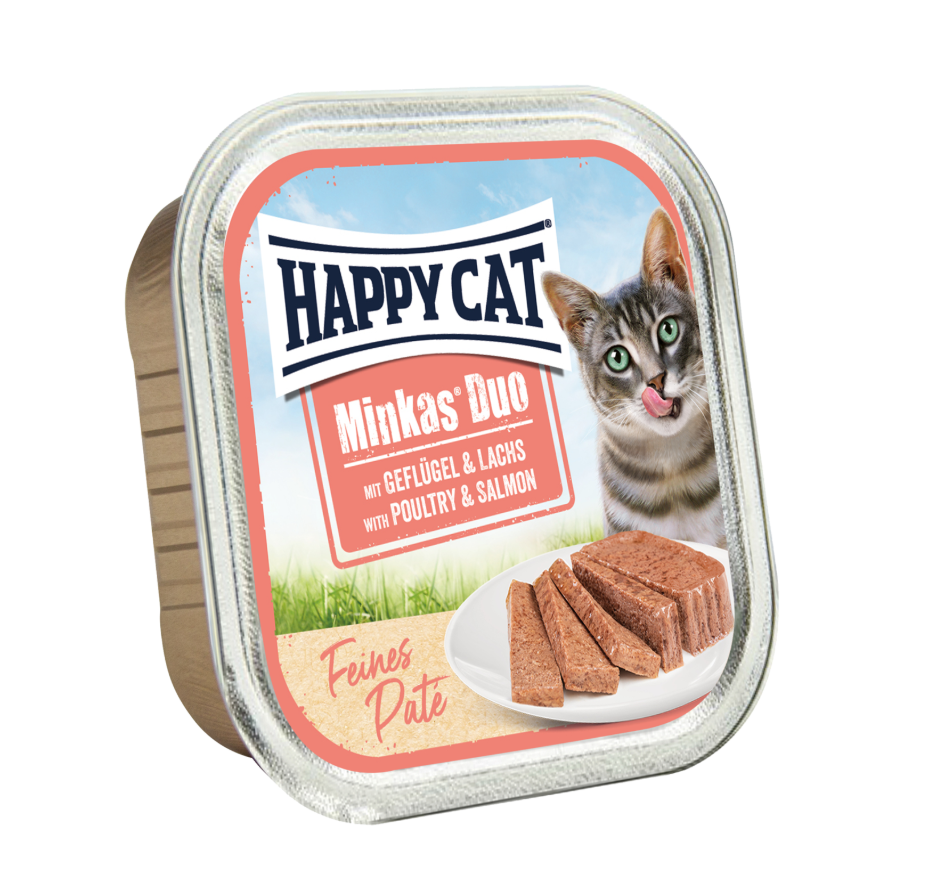 Happy Cat Minkas Duo - вкусный паштет, который заставит сердце вашей кошки биться чаще. Когда ваша кошка с удовольствием кушает паштет, она также получает большое количество жидкости.