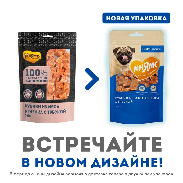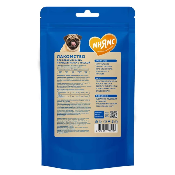 Главная Каталог Зоотовары Корм для собак Лакомства 100гр Лакомство Мнямс для собак "Кубики"из мяса Ягненка с Треской