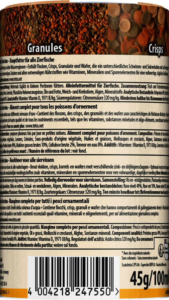 Тетра Селекшен предлагает вам выбор из четырех высококачественных полноценных кормов в разных ячейках, что позволяет целенаправленно кормить тропических рыбок во всех слоях воды.