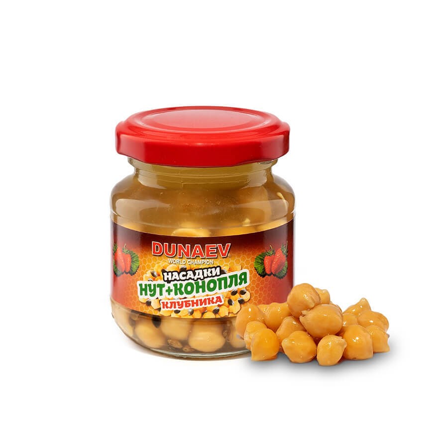 Среди многообразной продукции компании Dunaev имеются готовые натуральные насадки, в том числе «Нут-Конопля», представленная в нескольких ароматах (анис, клубника, чеснок). Нут – турецкий горох, используемый в качестве натуральной растительной насадки, которая не настолько распространена, как другие, тем не менее, попробовать её стоит каждому рыболову-карпятнику. Это отличное средство для рыбалки в условиях, где рыба очень привередлива в пище. Главное достоинство нута – его пищевая ценность, имеющая большое значение для рыбы. В нем содержится большое количество полезных микроэлементов и незаменимых аминокислот. Полезные свойства и высокая калорийность этой насадки придутся по вкусу даже таким гурманам, как карп и сазан.