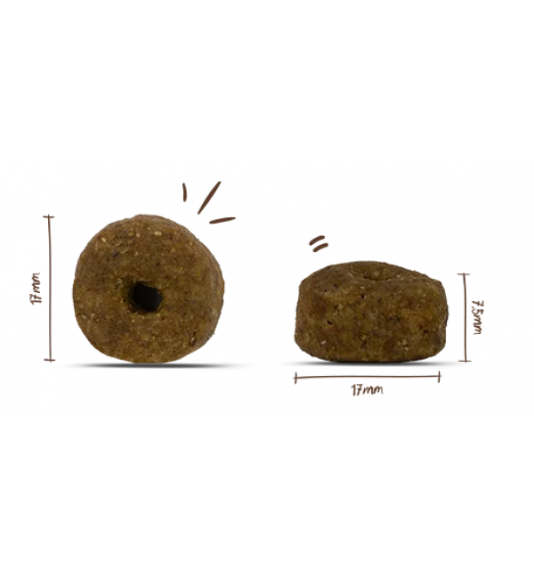 Состав: Свежие личинки Hermetia illucens (20%), картофель (сушеный, 15,5%), горох (сушеный, 15%), гороховый крахмал, картофельный белок, тапиока (сушеная, 6%), лососевый жир, чечевица (сушеная), льняное семя, гидролизат потейна (вегетарианский), дикальцийфосфат, дрожжи (сушеные, вкл. 0,1% маннанолигосахариды, 0,06% бета-глюканы), яблоко (сушеное, 1%), гороховая клетчатка, карбонат кальция, хлорид натрия, клюква (сушеная, 0,1%), зеленогубые мидии (сушеные, 0,1%), цикорий (сушеный).