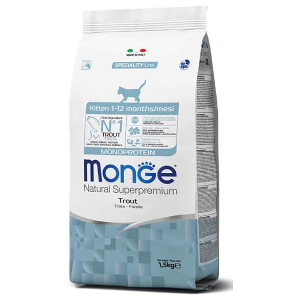 Monge Cat Monoprotein Kitten (Форель) — это монобелковый корм для котят с форелью. Сбалансированное содержание кальция и фосфора для поддержки роста котенка.