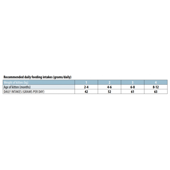 Рекомендации по кормлению: см. изображение. Рекомендуемое ежедневное потребление пищи (см. Таблицу) может быть разделено на 3 приема пищи в день. Индивидуальные потребности в питании могут варьироваться в зависимости от размера, возраста и уровня активности животного. Убедитесь, что у вас всегда под рукой чистая и свежая вода. Когда этот продукт заменяет другой тип корма и / или диеты, рекомендуется вводить его постепенно в течение как минимум одной недели. * Он может содержать следы другого источника белка. Только корм для домашних животных, не пригодный для употребления в пищу.