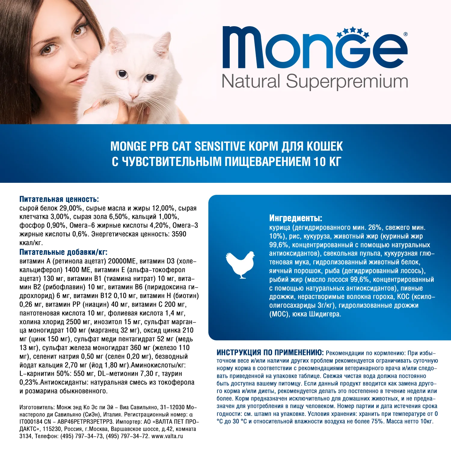 Monge (Монж) Cat PFB Daily Line Sensitive (Сенситив) сухой корм из мяса курицы для кошек и котов с чувствительным пищеварением.