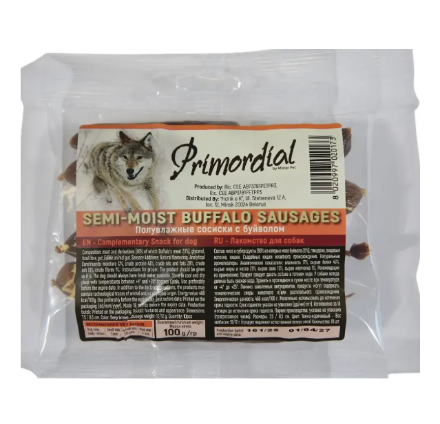 Главная Каталог Зоотовары Корм для собак Лакомства 114гр Лакомство Primordial для собак полувлажные Сосиски с Буйволом