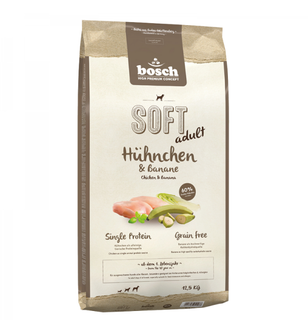 12,5кг Корм Bosch SOFT Holistic Adult полувлажный, монопротеиновый. Беззерновой для взрослых собак всех пород с Курицей и бананом
