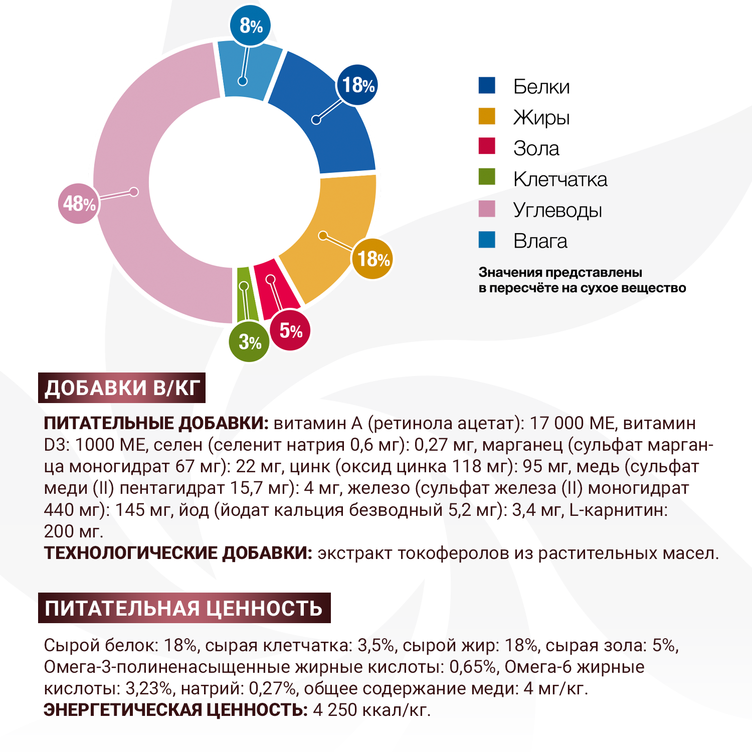 Питательные добавки: витамин А (ретинола ацетат): 17 000 МЕ, витамин D3: 1000 МЕ, селен (селенит натрия 0,37 мг): 0,17 мг, марганец (сульфат марганца моногидрат 38 мг): 12,4 мг, медь (сульфат меди (II) пентагидрат 3,7 мг): 0,9 мг, железо (сульфат железа (II) моногидрат 67,5 мг), йод (йодат кальция безводный 5,2 мг): 3,4 мг, L-карнитин: 200 мг.