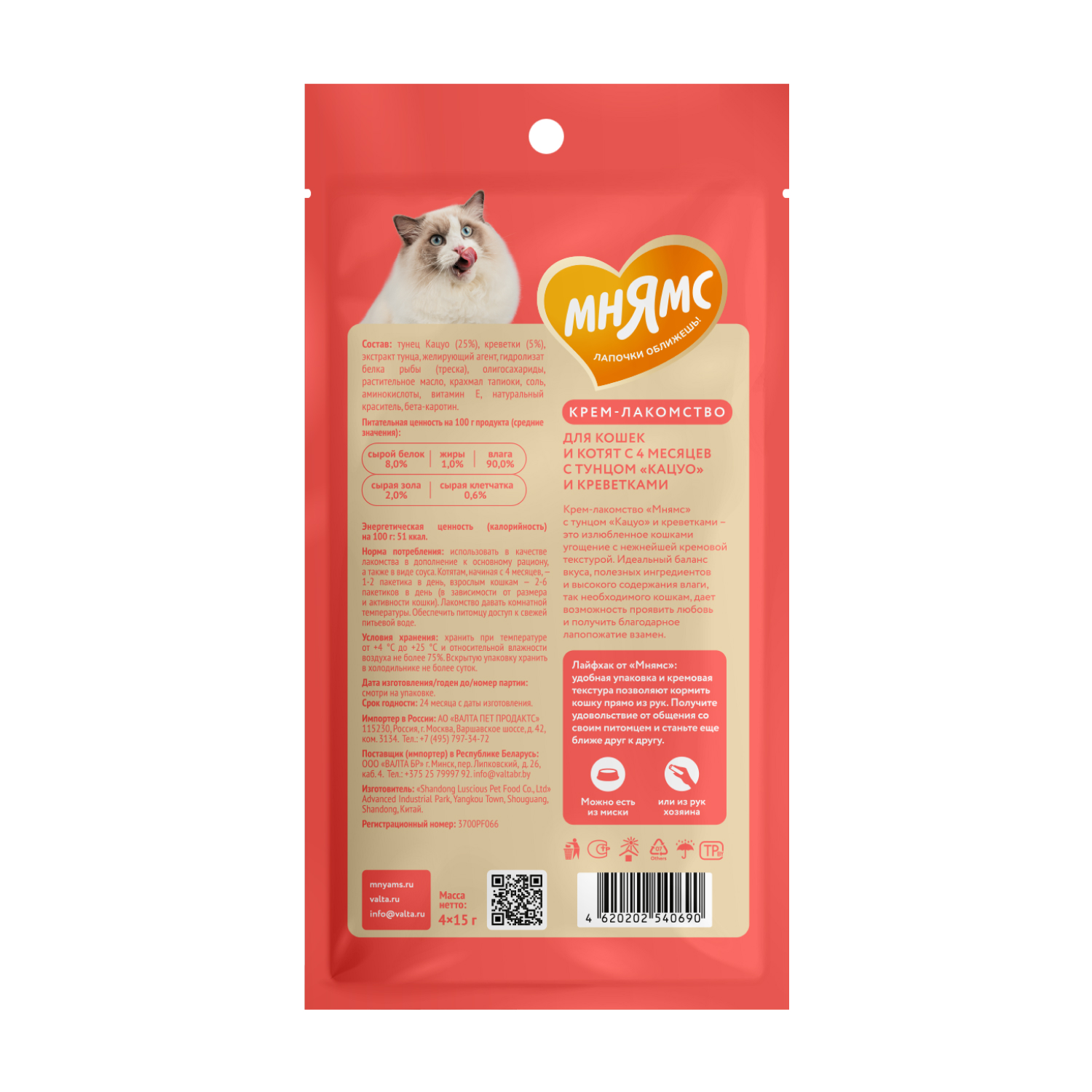 15г Крем-лакомство Мнямс для кошек с Тунцом Кацуо и креветками (срок 25.05.2026)