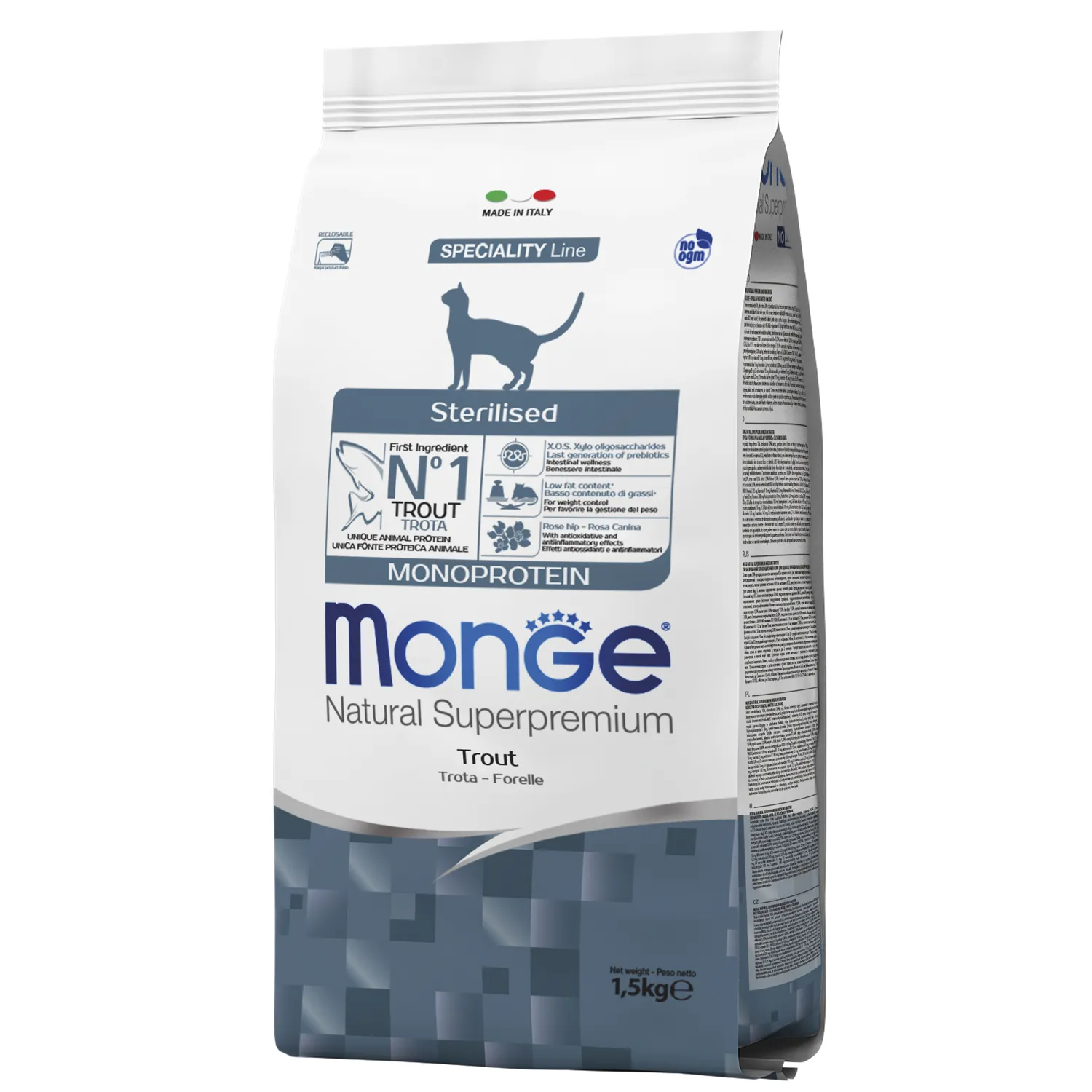1,5кг Корм Monge Cat Monoprotein Sterilized Trout для стерилизованных кошек с Форелью