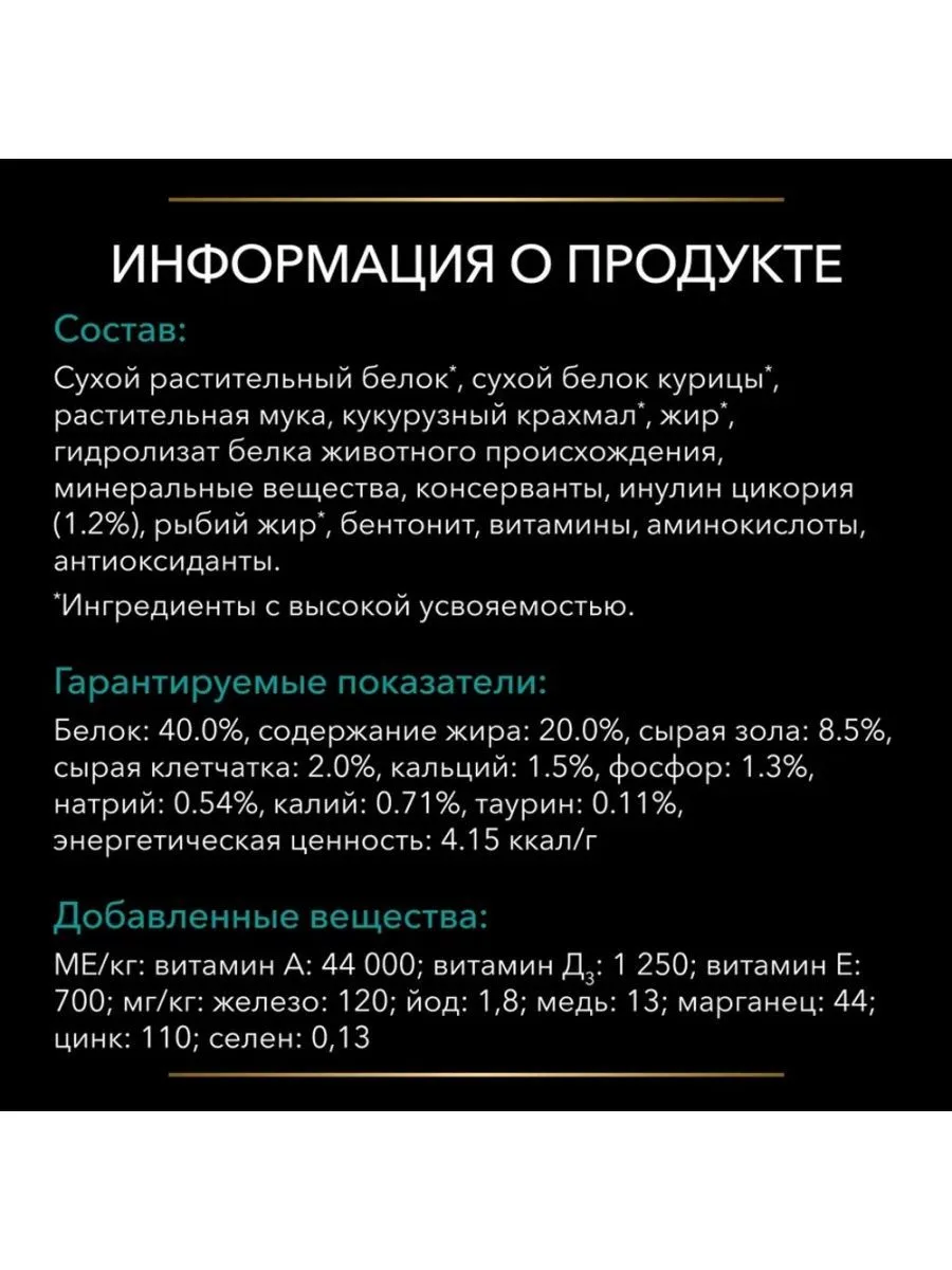 Состав: сухой растительный белок*, сухой белок курицы*, растительная мука, кукурузный крахмал*, жир*, гидролизат белка животного происхождения, минеральные вещества, консерванты, инулин цикория (1.2%), рыбий жир*, бентонит, витамины, аминокислоты, антиоксиданты.