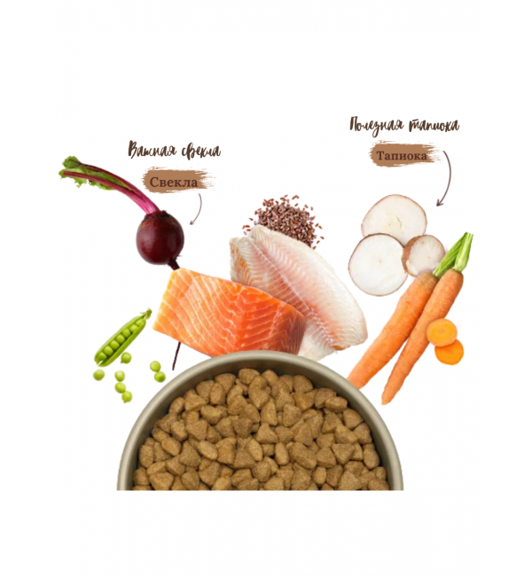 Состав: Свежая курица, сертифицированная Animal Welfare Initiative (18 %), свежий североморский лосось (14 %), свежая индейка, сертифицированная Animal Welfare Initiative (12 %), гороховый крахмал, горох (сушеный, 10 %), картофельный крахмал, свежая форель (9 %), тапиока (сушеная, 4 %), картофель (сушеный, 2,5 %), гороховая клетчатка, гидролизат белка, монокальцийфосфат, лососевое масло, свекла (сушеная, 0,2 %), хлорид натрия, семена льна (0,2 %), шиповник (сушеный), морковь (сушеная, 0,1 %), мак перистый (сушеный, 0,1 %), цикорий (сушеный).