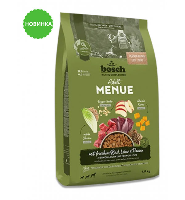 Корм Bosch для собак HPC MENUE Adult со свежей говядиной и субпродуктами + рожью и овсом — это разнообразный хрустящий корм для сбалансированного и полезного рациона для вашей взрослой собаки в возрасте от 12 месяцев.