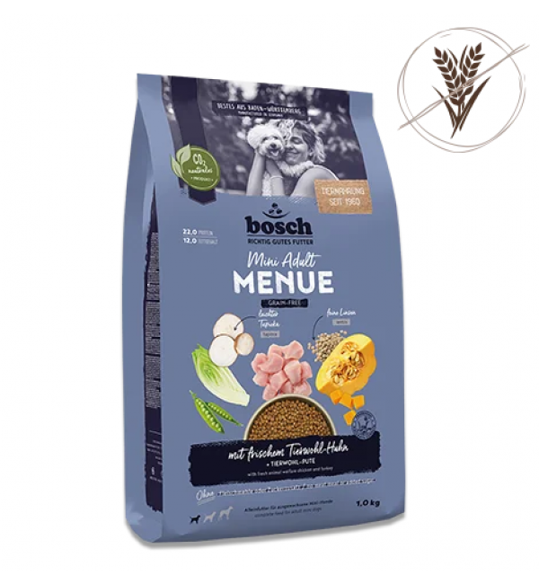 Корм для собак мелких пород HPC MENUE Mini Adult с курицей, без зерна — это разнообразный хрустящий корм для сбалансированного и полезного рациона для вашей взрослой мини-собаки в возрасте от 12 месяцев.