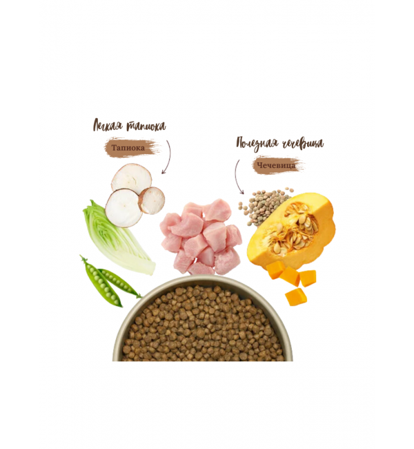 Свежая курица (40 %), свежая индейка (10 %), картофель (сушеный, 9 %), гороховый крахмал, горох (сушеный, 7,5 %), картофельный крахмал, тапиока (сушеная, 4 %), клетчатка гороха, дикальцийфосфат, масло лосося, гидролизат белка, жир птицы, чечевица (сушеная, 0,5 %), хлорид натрия, тыква (сушеная, 0,2 %), семена льна, плоды шиповника (сушеные), мак махровый (сушеный, 0,1 %), цикорий (сушеный, 0,05 %).