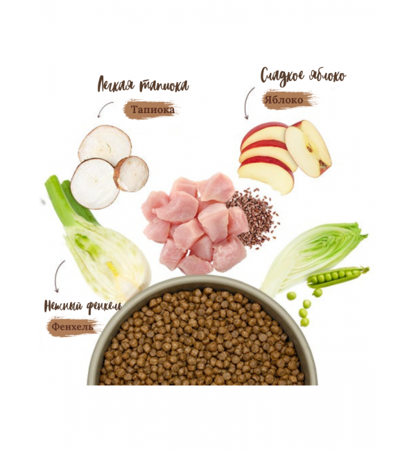 Состав: Свежая курица, сертифицированная Animal Welfare Initiative (40 %), картофельный крахмал, горох (сушеный, 10 %), свежая индейка, сертифицированная Animal Welfare Initiative (10 %), картофель (сушеный, 5 %), гороховый крахмал, тапиока (сушеная, 4 %), лососевое масло, гидролизат белка, дикальцийфосфат, яблочные выжимки (сушеные), семена льна (0,5 %), хлорид натрия, фенхель (сушеный, 0,2 %), яблоки (сушеные, 0,2 %), плоды шиповника (сушеные), мак перистый (сушеный, 0,1 %), цикорий (сушеный, 0,05 %).