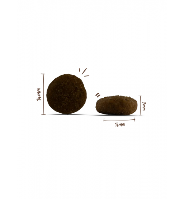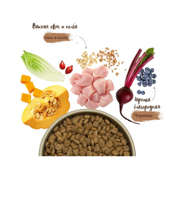 Состав: Свежая курица, сертифицированная Animal Welfare Initiative (42 %), овес (20 %), картофельный крахмал, свежая индейка, сертифицированная Animal Welfare Initiative (8 %), спельта (5 %), целлюлоза, гидролизат белка, гороховый крахмал, дикальцийфосфат, лососевое масло, хлорид натрия, тыква (сушеная, 0,25 %), свекла (сушеная, 0,25 %), черника (сушеная, 0,25 %), семена льна, хлорид калия, шиповник (сушеный, 0,1 %), мак перистый (сушеный, 0,1 %), цикорий (сушеный, 0,05 %).
