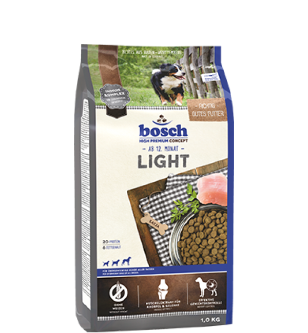 Сухой корм для собак Bosch Light создан по особой формуле на основе свежего мяса домашней птицы без использования пшеницы, с умеренным содержанием белка и уменьшенным содержанием жира, что великолепно подходит животным с лишним весом и склонностью к ожирению. Благодаря повышенному содержанию полезных минералов и витаминов, корм снабжает организм животных всеми необходимыми полезными веществами и предотвращает дефицит питания. Использование экстракта зеленогубчатого моллюска благотворно влияет на развитие хрящей и суставов животного. Благодаря содержанию специфического иммунного комплекса маннанов и глюканов (разработанных ветеринарами), корм способствует укреплению иммунной системы и организма собаки.