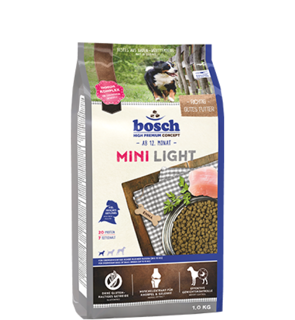 1кг Корм Bosch Mini Light для взрослых собак мелких пород, склонных к полноте с Птицей