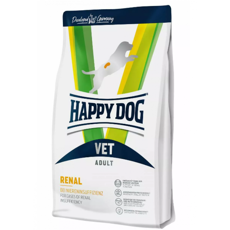 Happy Dog VET Diet Renal - имеет сниженное содержание фосфора, натрия и протеина в соответствии с минимальными потребностями при хронической почечной недостаточности, гипертензии, нефрите. Стимуляция аппетита за счет повышенной вкусовой привлекательности.