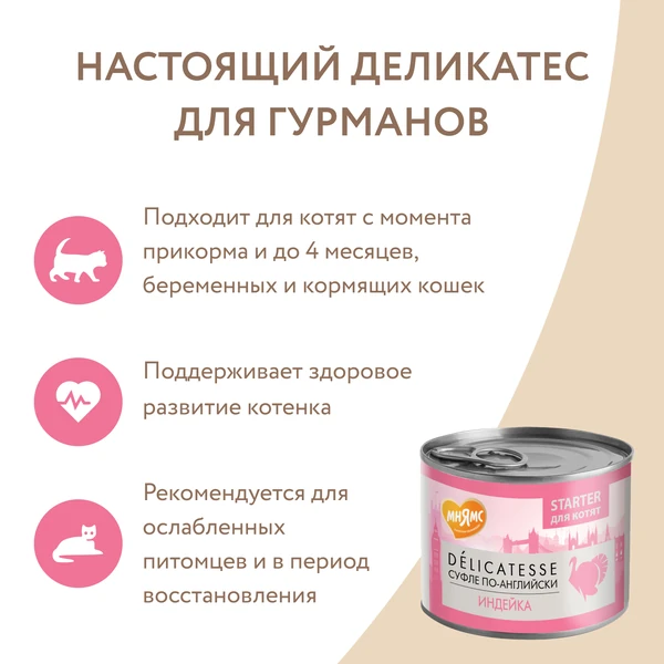 200г Консерва Мнямс Delicatesse "Суфле по-английски" для котят с начала прикорма до 4 месяцев, беременных и кормящих кошек, паштет из Индейки