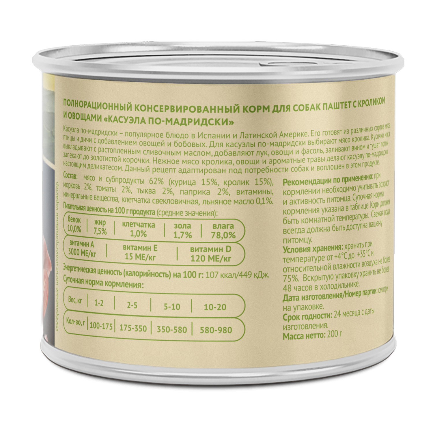 Полнорационный консервированный корм для собак "Касуэла по-мадридски". Паштет с кроликом и овощами. Суперпремиальный паштет с высоким содержанием мяса, созданный по мотивам культовых рецептов разных стран, адаптированных под собак всех пород.