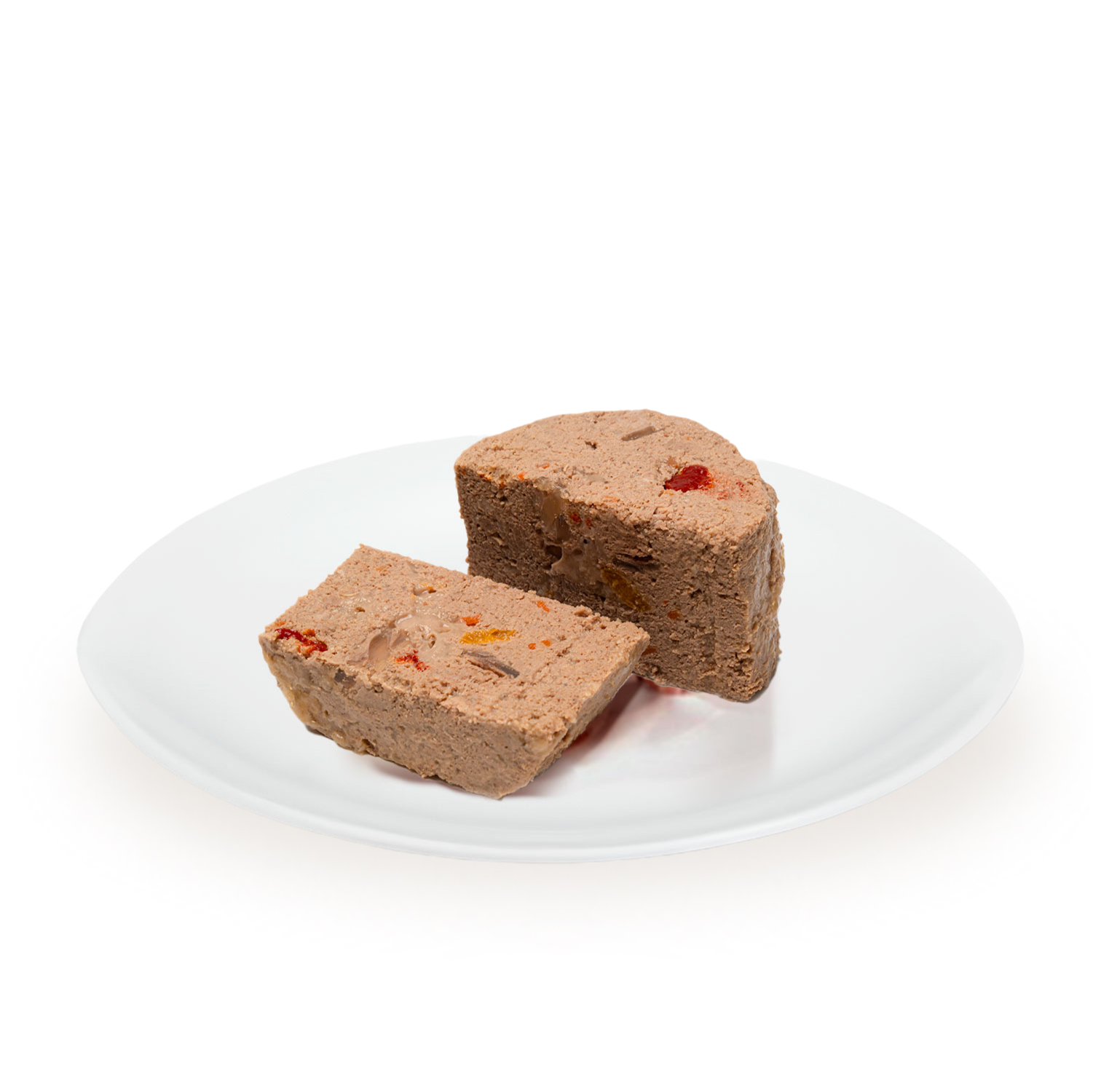 Состав: мясо и субпродукты 62% (курица 15%, кролик 15%), морковь 2%, томаты 2%, тыква 2%, паприка 2%, витамины, минеральные вещества, клетчатка свекловичная, льняное масло 0,1%.