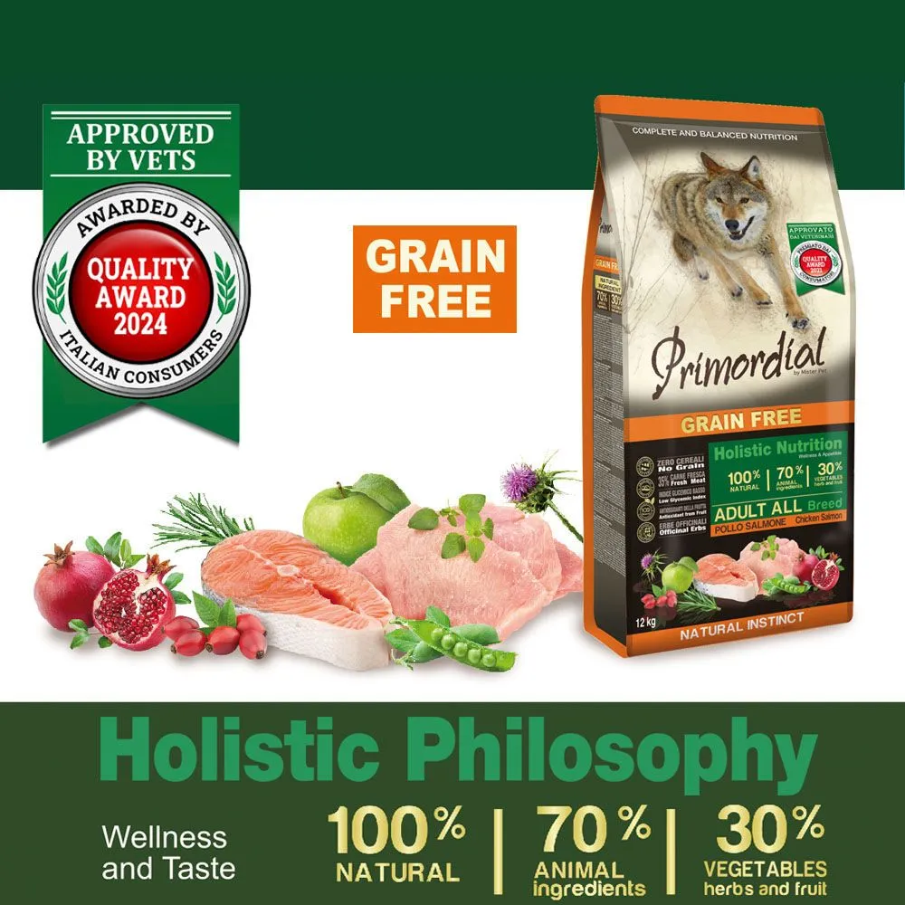 Беззерновой корм Primordial Grain Free Adult All Breeders Nutrition Chicken & Salmon с курицей и лососем для взрослых собак всех пород.