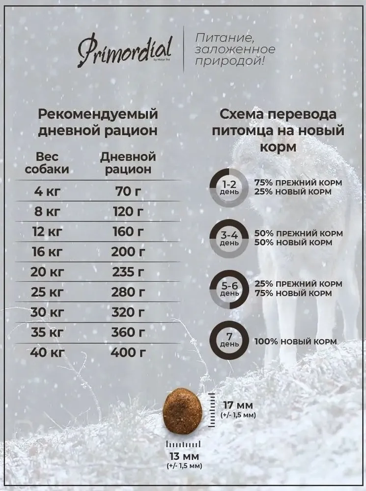 Primordial Grain Free All Adult с ягненком и тунцом для взрослых собак всех пород - специальный рацион, который учитывает самый древний и естественный инстинкт питания собак - большое количество мяса и незначительное количество злаков. С анатомической точки зрения собаки являются хищниками, о чем свидетельствует их способ жевания (зубы и челюсть) и короткий кишечник, поэтому они предпочитают диету с большим количеством мяса (белки) и незначительным количеством злаков (углеводы). Линия Primordial Grain Free благодаря отсутствию злаков и 70% специально отобранных видов мяса поддерживает низкий гликемический индекс, 35% свежего мяса гарантируют высокую аппетитность и перевариваемость корма; за счет приготовления на пару структура белков остается ненарушенной, а сами белки становятся готовыми к усваиванию. Благодаря высокой вкусовой привлекательности Primordial (примордиал) представляет собой лакомство для питомца, лакомство для собак.