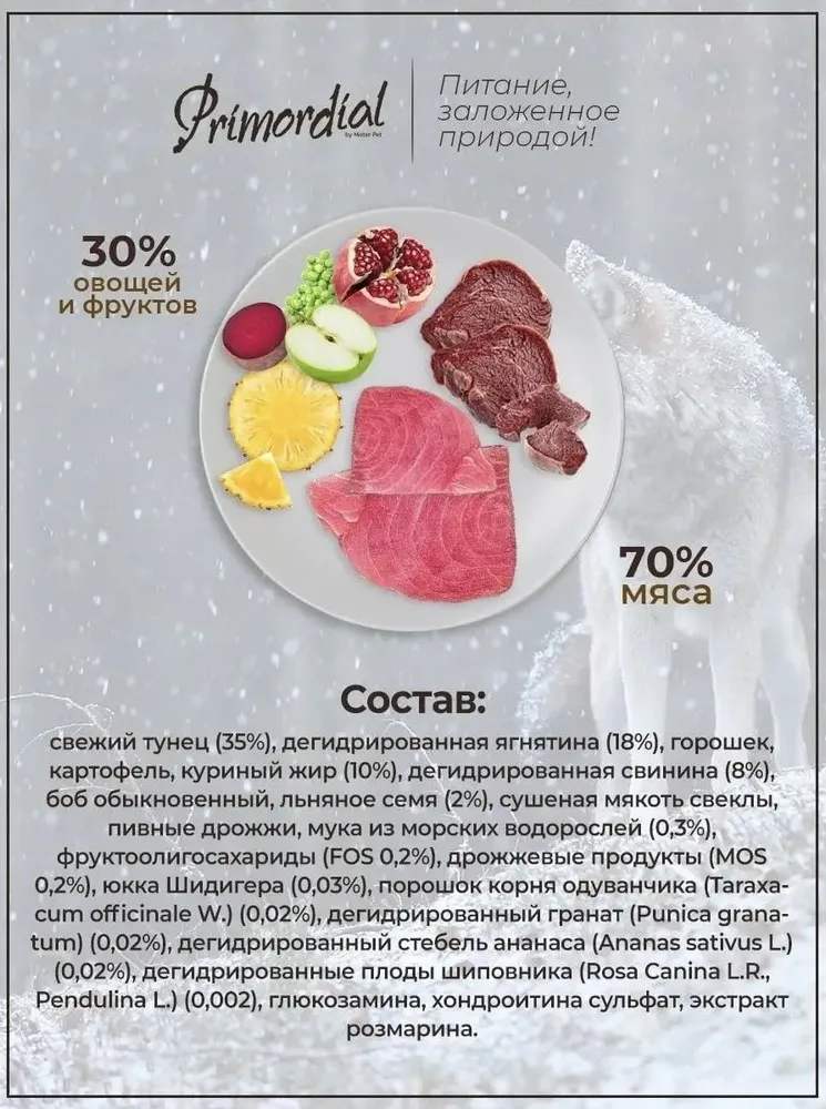 20кг Корм Primordial Dog Adult Breeders Tuna & Lamb беззерновой для взрослых собак всех пород с Тунцом и ягненком