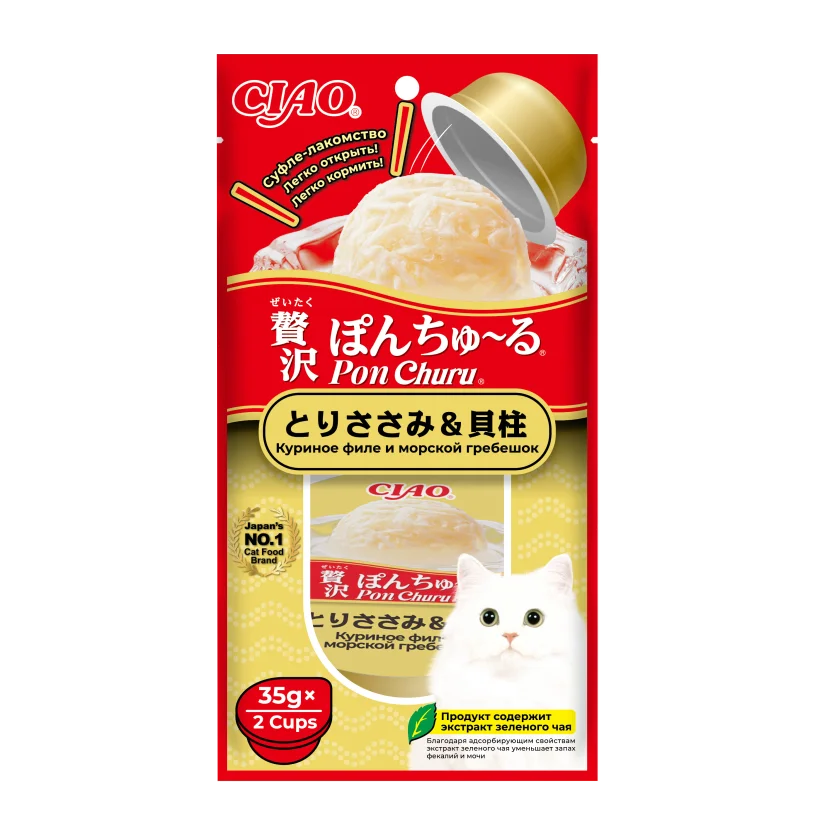 2*35гр Лакомство INABA CIAO Pon Churu для кошек Куриное филе и морской гребешок