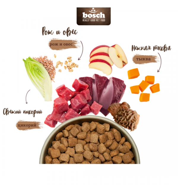 Корм Bosch для собак HPC MENUE Adult со свежей говядиной и субпродуктами + рожью и овсом — это разнообразный хрустящий корм для сбалансированного и полезного рациона для вашей взрослой собаки в возрасте от 12 месяцев.