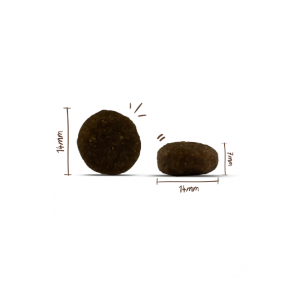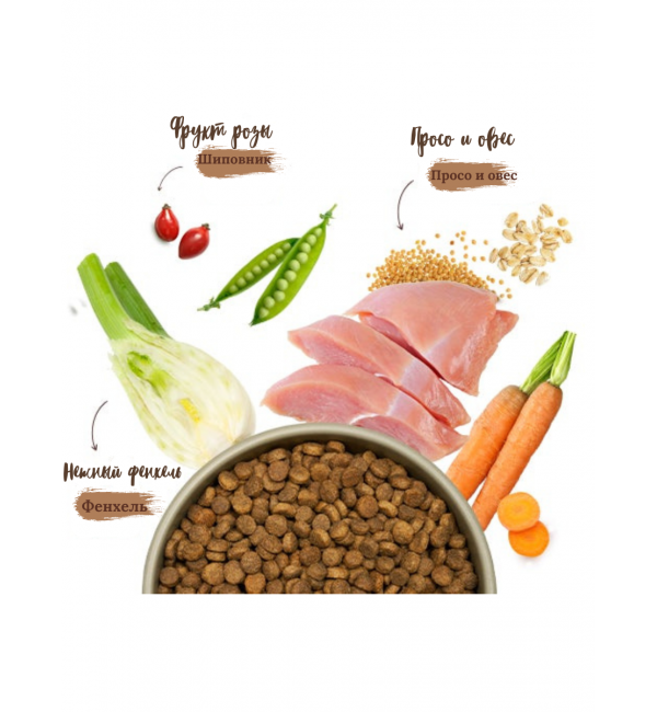 Состав:  Свежая курица, сертифицированная Animal Welfare Initiative (38 %), сорго (Milo, 17 %), свежая индейка, сертифицированная Animal Welfare Initiative (12 %), гороховый крахмал, картофельный крахмал, овес (4 %), лососевое масло, дикальцийфосфат, гидролизат белка, горох (сушеный, 0,9 %), семена льна, хлорид натрия, фенхель (сушеный, 0,2 %), плоды шиповника (сушеные, 0,2 %), хлорид калия, морковь (сушеная, 0,1 %), мак перистый (сушеный, 0,1 %).