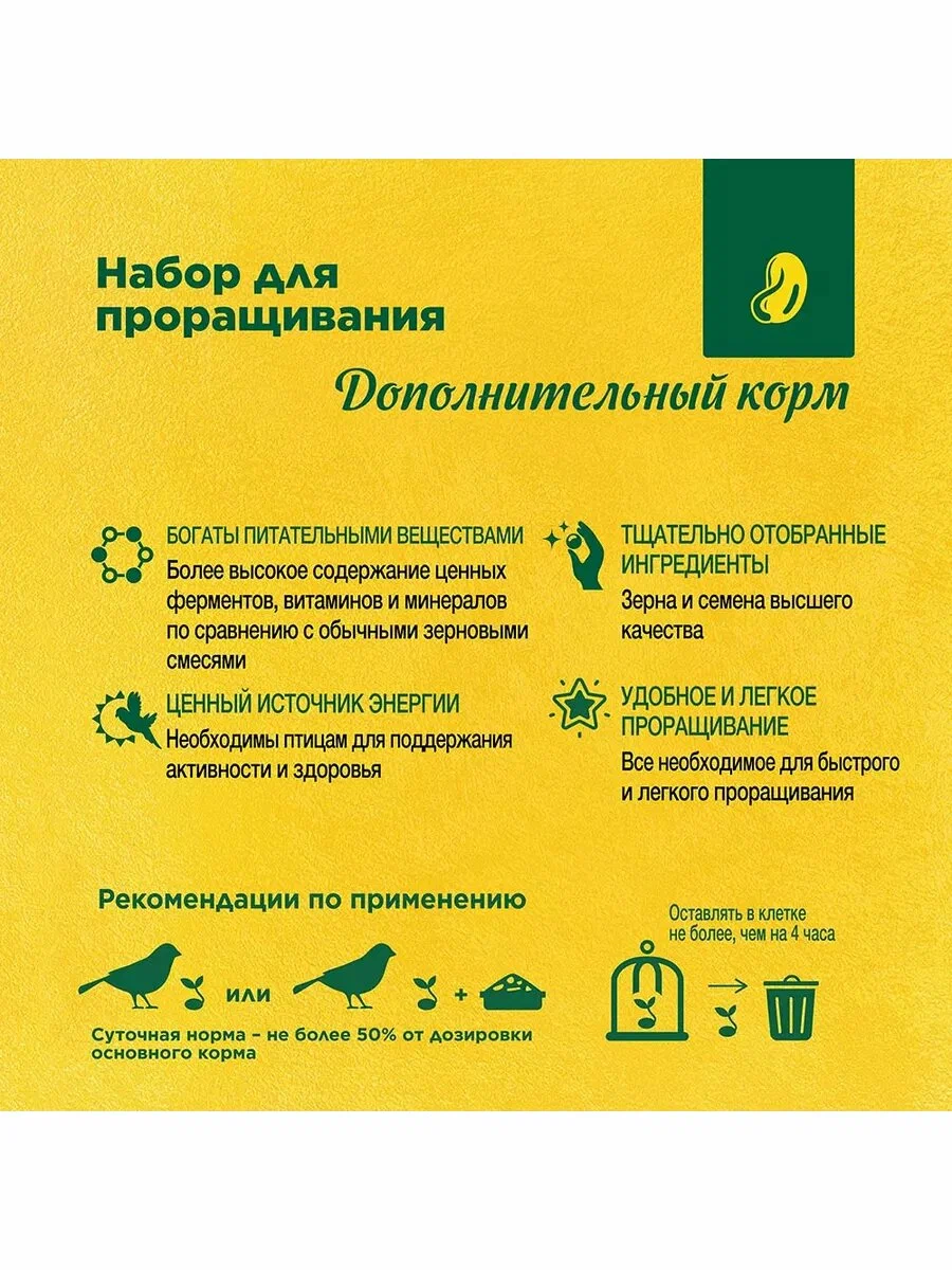 RIO Набор для проращивания для всех видов птиц — дополнительный корм для декоративных птиц. Проращенные зерна и семена - полноценная замена семенам в стадии молочно-восковой спелости, которыми птицы питаются в естественной среде. По сравнению с обычным кормом, проращенные зерна отличаются высоким содержанием ферментов, витаминов и минералов, что поможет избежать последствий несбалансированного питания.