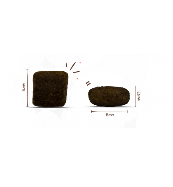 Состав: Картофель (сушеный, 45%), свежая форель (12,5%), форелевая мука (12,5%), горох (сушеный), свекольный жом (обессахаренный), жир птицы, картофельный белок, гидролизат белка (растительный), монокальцийфосфат, дрожжи (сушеные), рыбий жир (1%), цикорий (сушеный, 0,1%), глюкозамин, хондроитинсульфат.