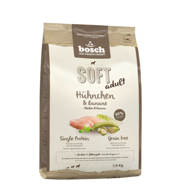 2,5кг Корм Bosch SOFT Holistic Adult полувлажный, монопротеиновый. Беззерновой для взрослых собак всех пород с Курицей и бананом