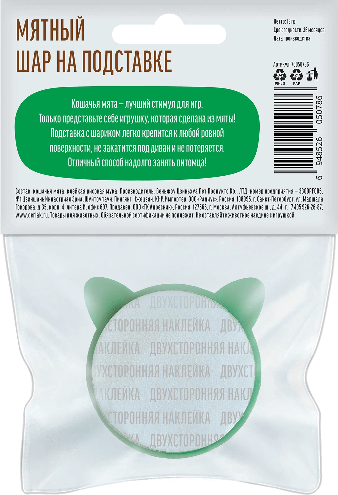 Подставка с шариком легко крепится к ровной поверхности, не закатится под диван и не потеряется. Диаметр шара — 3 см. Эту игрушку можно даже съесть. Она состоит только из натуральных ингредиентов. Ваша кошка получит огромное удовольствие.