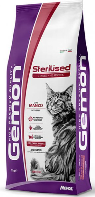 Gemon Cat Sterilized (Говядина)Gemon Cat Sterilized (Говядина) — это полноценный корм для стерилизованных взрослых кошек. Состав характеризуется качественными ингредиентами, такими как говядина, источник необходимых питательных веществ, и рис, источник углеводов, приготовленные и легко усвояемые в процессе экструзии. Идеальная диета для стерилизованных кошек с пребиотиками, фруктоолигосахаридами (ФОС) и маннаноолигосахаридами (МОС) для поддержания хорошего состояния кишечника и свекольным жомом для поддержания идеальной массы тела. Содержит свежее мясо для оптимального вкуса и масло лосося для блеска и мягкости шерсти.Также в состав входит юкка Шидигера для контроля кишечных запахов и без добавления искусственных красителей и консервантов.