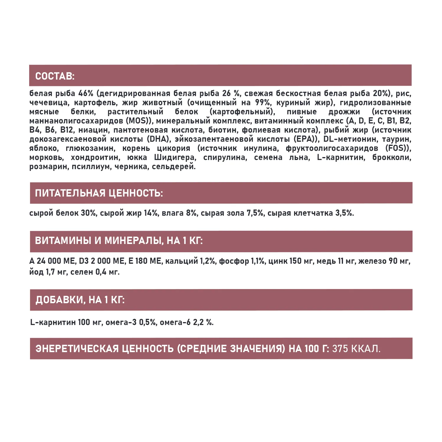 Состав: белая рыба 46% (дегидрированная белая рыба 26 %, свежая бескостная белая рыба 20%), рис, чечевица, картофель, жир животный (очищенный на 99%, куриный жир), гидролизованные мясные белки, растительный белок (картофельный), пивные дрожжи (источник маннанолигосахаридов (MOS)), минеральный комплекс, витаминный комплекс (A, D, E, С, В1, В2, В4, B6, В12, ниацин, пантотеновая кислота, биотин, фолиевая кислота), рыбий жир (источник докозагексаеновой кислоты (DHA), эйкозапентаеновой кислоты (EPA)), DL-метионин, таурин, яблоко, глюкозамин, корень цикория (источник инулина, фруктоолигосахаридов (FOS)), морковь, хондроитин, юкка Шидигера, спирулина, семена льна, L-карнитин, брокколи, розмарин, псиллиум, черника, сельдерей.