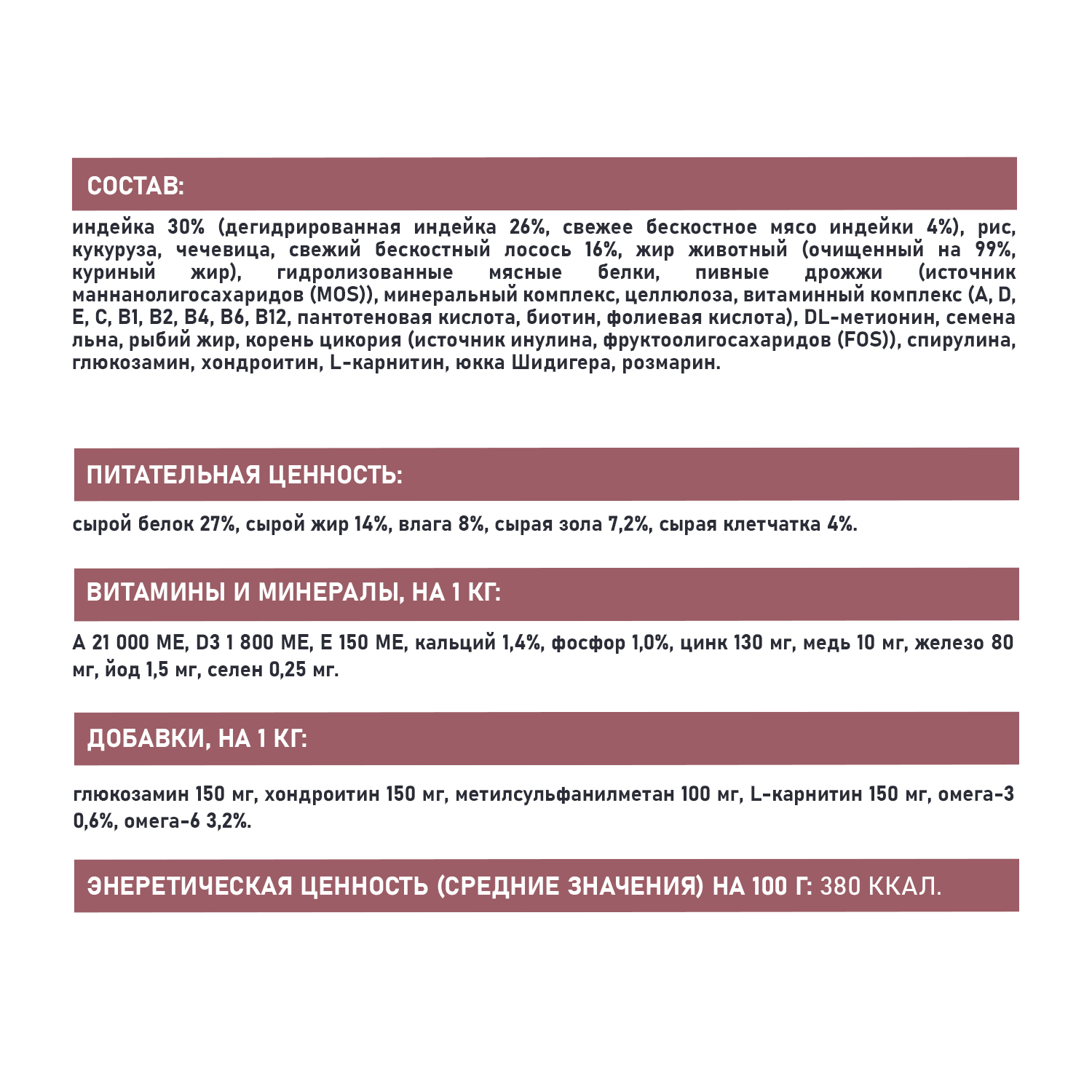 Добавки на 1кг: глюкозамин 150 мг, хондроитин 150 мг, метилсульфанилметан 100 мг, L-карнитин 150 мг, омега-3 0,6%, омега-6 3,2%.