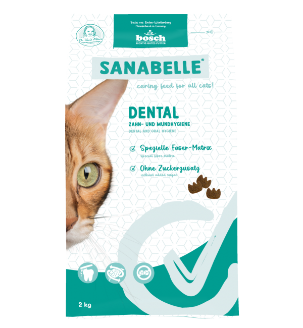 Сухой корм Bosch Sanabelle DENTAL произведён на основе свежего мяса домашней птицы для взрослых кошек всех пород с чувствительными дёснами и полостью рта. Специальные крокеты во время приёма пищи помогают очищать поверхность зубов. Корм Bosch Sanabelle DENTAL для кошек насыщенный питательными веществами и минералами, позволяет кошкам получать все необходимые полезные элементы, способствует нормализации пищеварения, не вызывает аллергий и пищевой непереносимости, а также  оказывают положительное влияние на слизистую оболочку полости рта и состояние зубов.