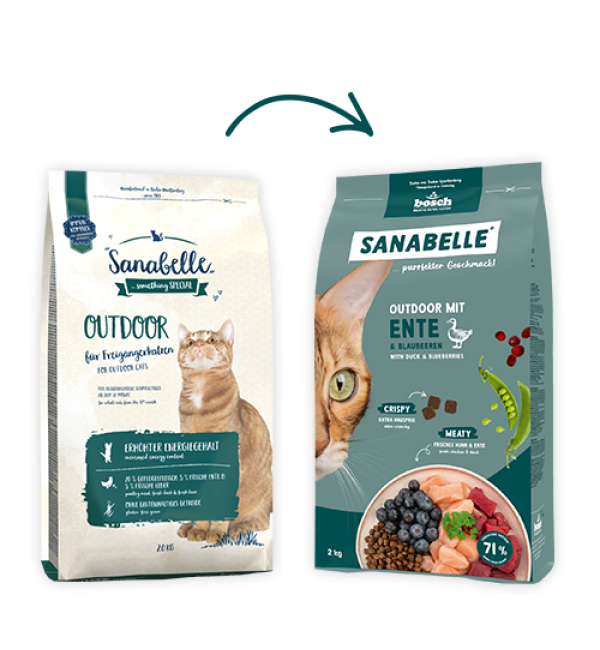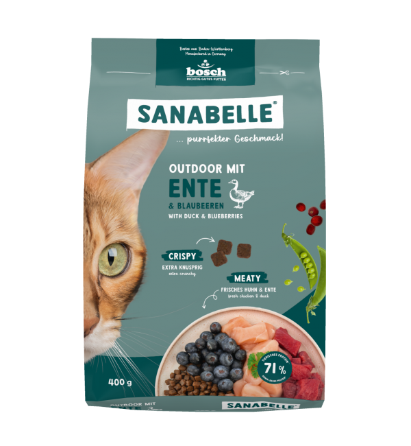 Будь то смелый охотник или любопытный бродячий – с Sanabelle Outdoor со свежей уткой и черникой, о вашей кошке полностью заботятся: соответствующая виду, энергичная и полная удовольствия.